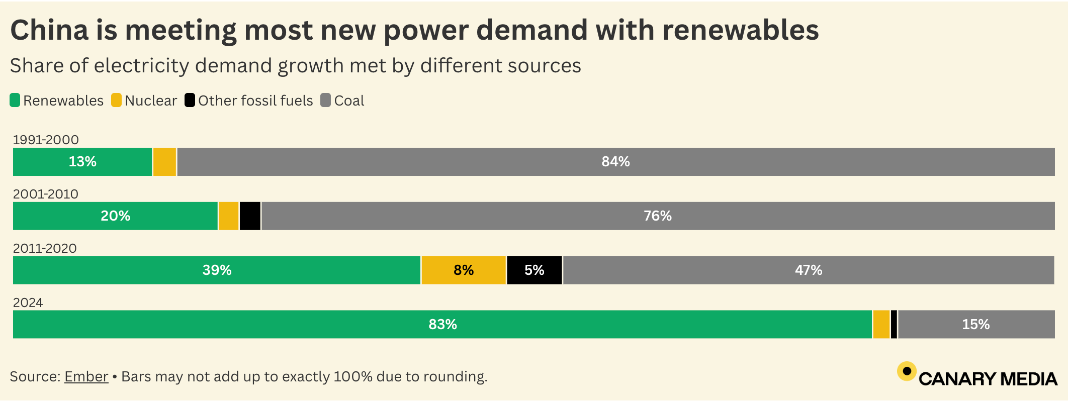 A strongly held thesis here at Cold Eye Earth is that wind, solar, and storage will eventually come to dominate 100% (or nearly 100%) of all marginal growth in global power. Over the past five years, this domination has landed in the U.S. power system, and it’s also been the case for a longer period of time in the E.U. This inevitably leads to the question: what about in China? And here we have good news directionally, but we still have some ways to go. This chart, from the good folks at Canary Media, is a really nice depiction of the progress being made.