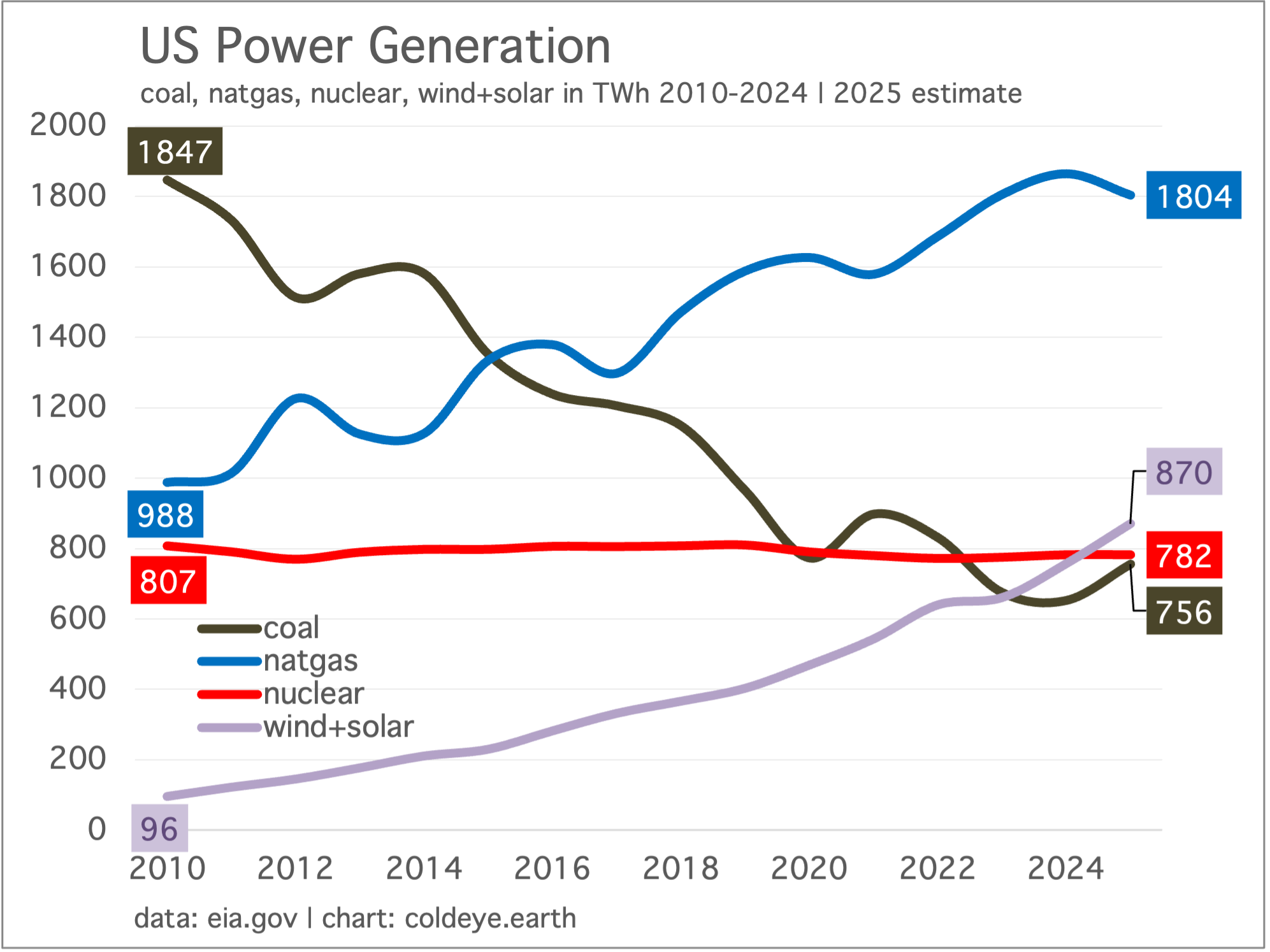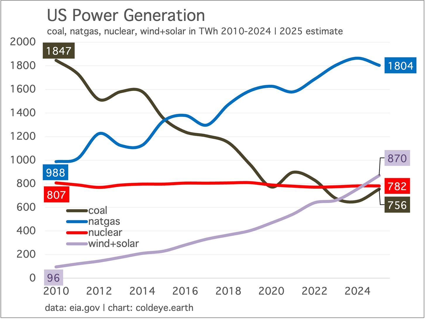 As a reminder that the coal factor is still very real, and will not be dislodged by WSS alone, the chart below is a companion to the measure of wind and solar vs. nuclear and demonstrates that both nuclear and coal generation are heading in the wrong direction. In the fight against coal, why would you not call upon nuclear to pull up the rear, even as WSS governs and dominates at the tip of the spear?
