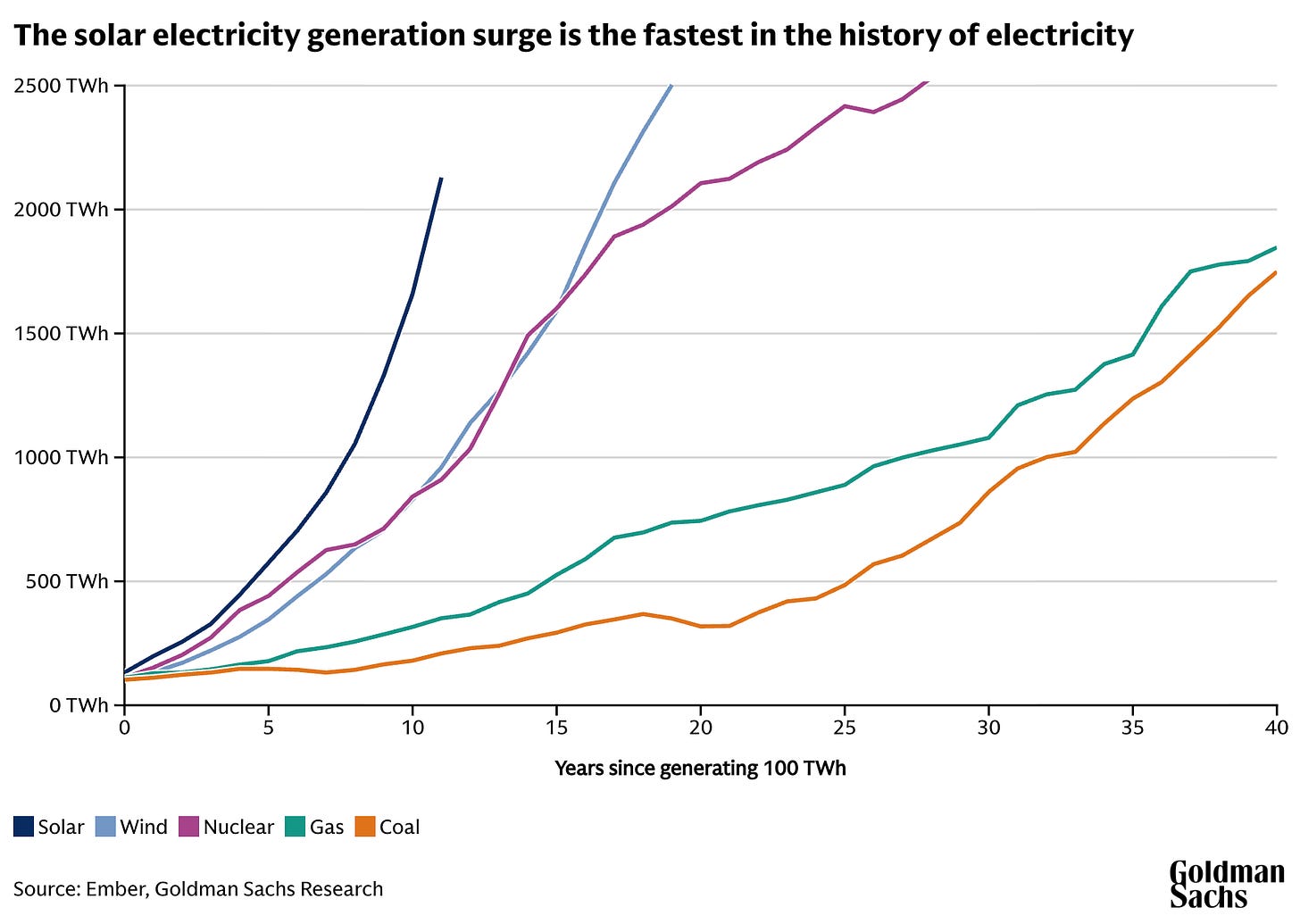 According to Goldman Sachs research, global solar generation has grown faster than any technology in the history of electricity, easily beating the adoption of gas and coal, and even nuclear and wind power. Makes sense, does it not? Solar panels are manufactured and therefore enjoy the phenomenon whereby costs fall as output rises. Unlike mined, drilled, and excavated fossil fuels, solar has high capex and ultra-low opex. Once erected, a solar plant simply runs. That’s the difference between combustion, which never sleeps, and solar—which is an energy collection device. From the Goldman Sachs solar report: