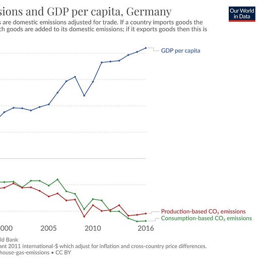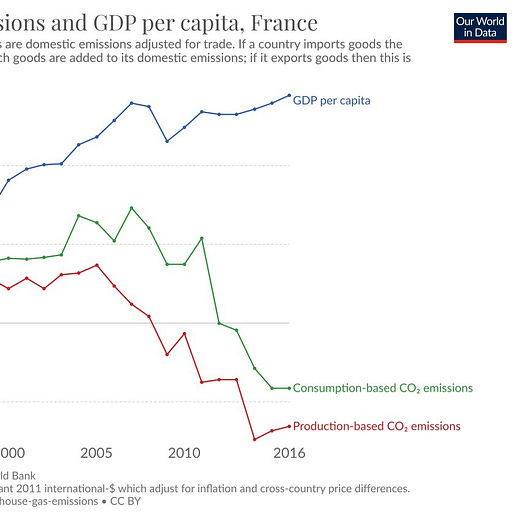 The final chart in the set of Max Roser examples (up above) is instructive because the UK very much embodies the accounting challenges for a modern economy that 1. outputs large volumes of intellectual products, 2. imports large volumes of products manufactured abroad, and 3. has done an extraordinary job converting its electricity to wind and solar, while also using a lot less oil. Emissions are an excellent unit of account and it’s simply inarguable that the UK is growing GDP, in this case, as trade-adjusted emissions fall.
