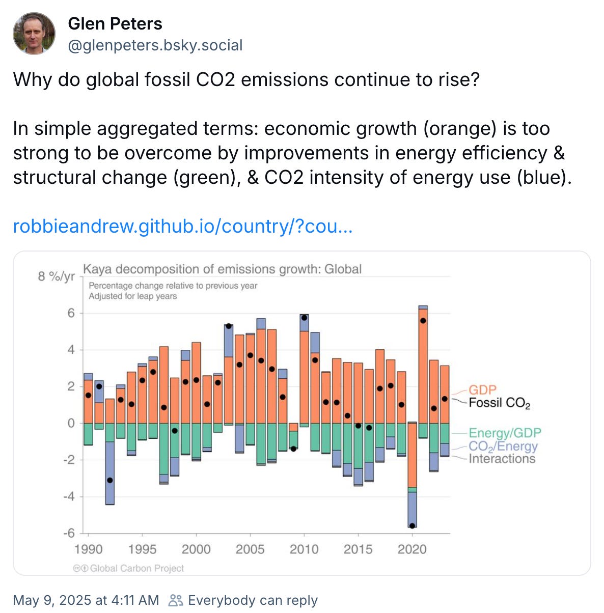 Let’s also place here additional commentary from a Glen Peters, a colleague of Robbie Andrew, at CICERO. The image below has been linked to the original on BlueSky. Note again the familiar theme: economic growth is hard to overcome.