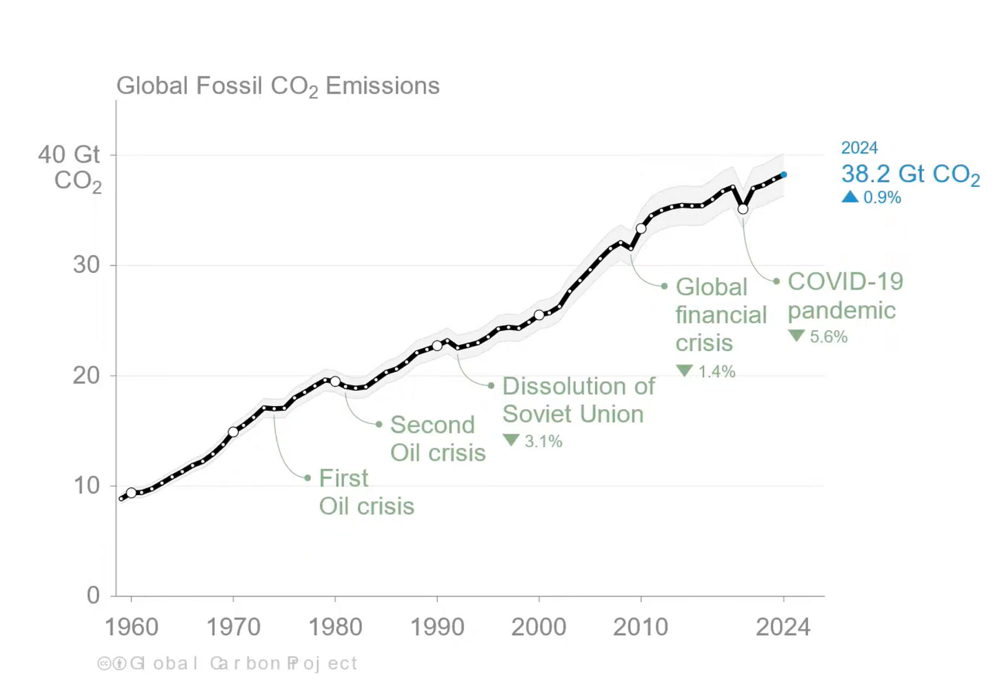One think-tank that’s been admirably steadfast in not making peak predictions is CICERO, based in Oslo, Norway. Recently, CICERO’s Robbie Andrew gave a nice update on the global emissions picture, and you can watch that clip on YouTube. One useful point Andrew makes, is that when we look back over the past half-century, the only times global emissions decline is during crises. Indeed—because the only time economic growth contracts is during these crises. | snapshot from Andrew’s talk: