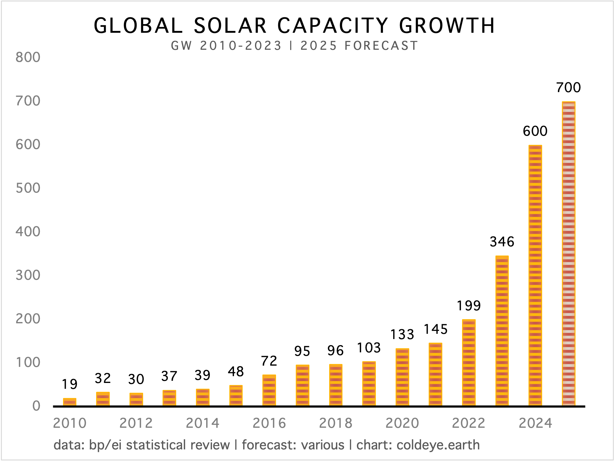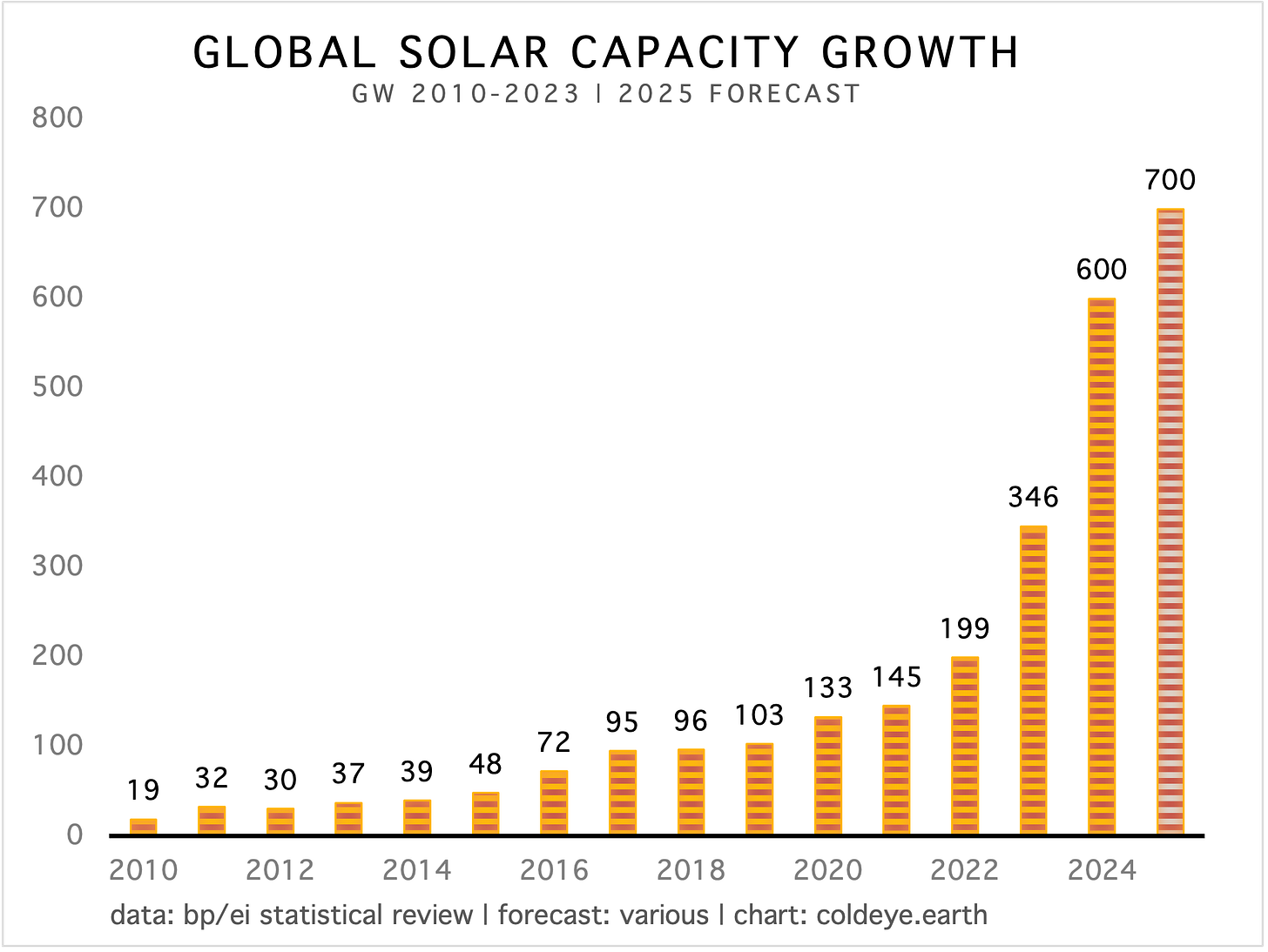 Global solar growth continues to amaze. Current estimates are that capacity additions were near/at 600 GW last year, and that the world will build an additional 700 GW this year. The only growth constraint that still exists for solar (having knocked down all its previous barriers quite nicely) is the enduring economic competitiveness of existing, incumbent generation from coal and natural gas.