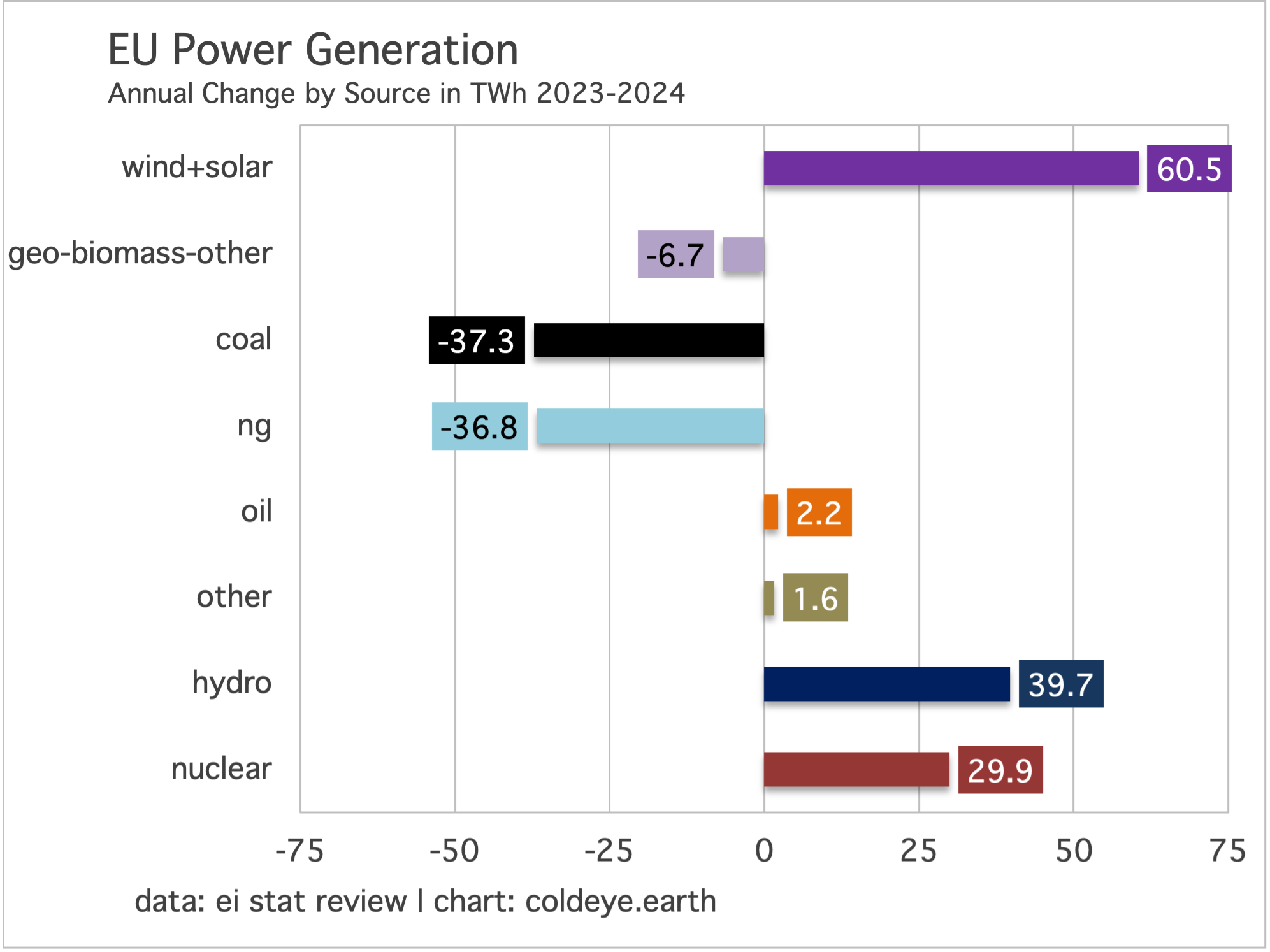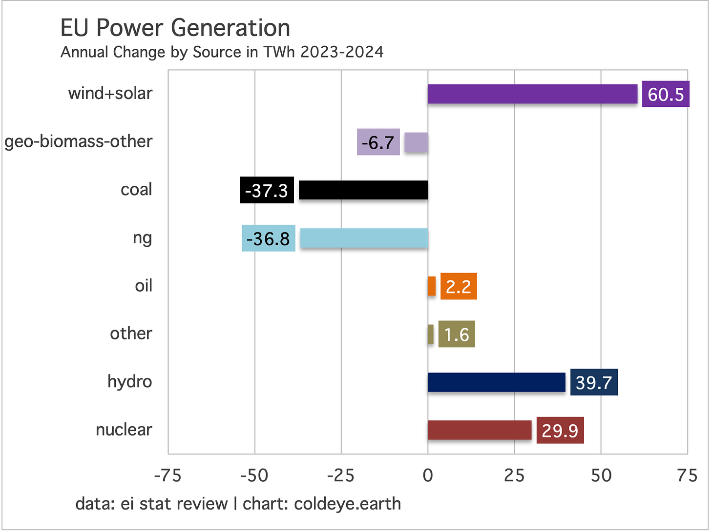 If you sum each of the totals in the chart, the product will be 53.1 TWh. That’s the net advance of generation from all sources. And yet, that total is lower than the annual increase in wind and solar alone, of 60.5 TWh. While it’s too early to say whether the EU can repeat such a performance in the years ahead, it’s worth considering a small signal is starting to flash here that even when the EU power system is gaining hydro and nuclear output—and losing coal, natural gas, and geothermal/biomass output—it has roared ahead regardless with enough wind and solar to overwhelm the system with bountiful, new clean energy.