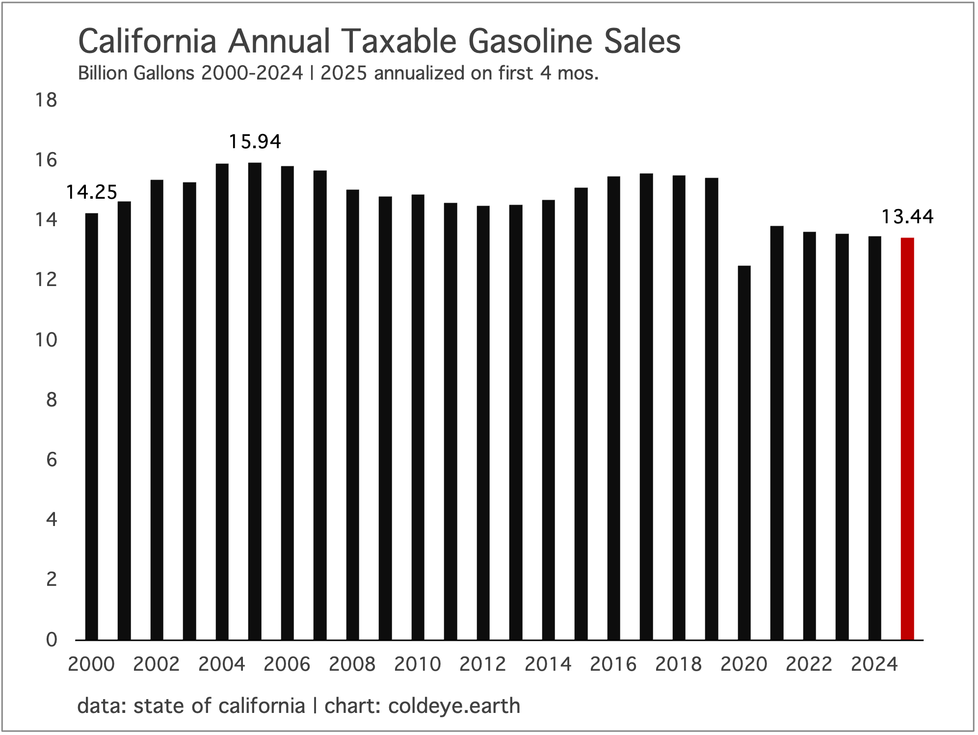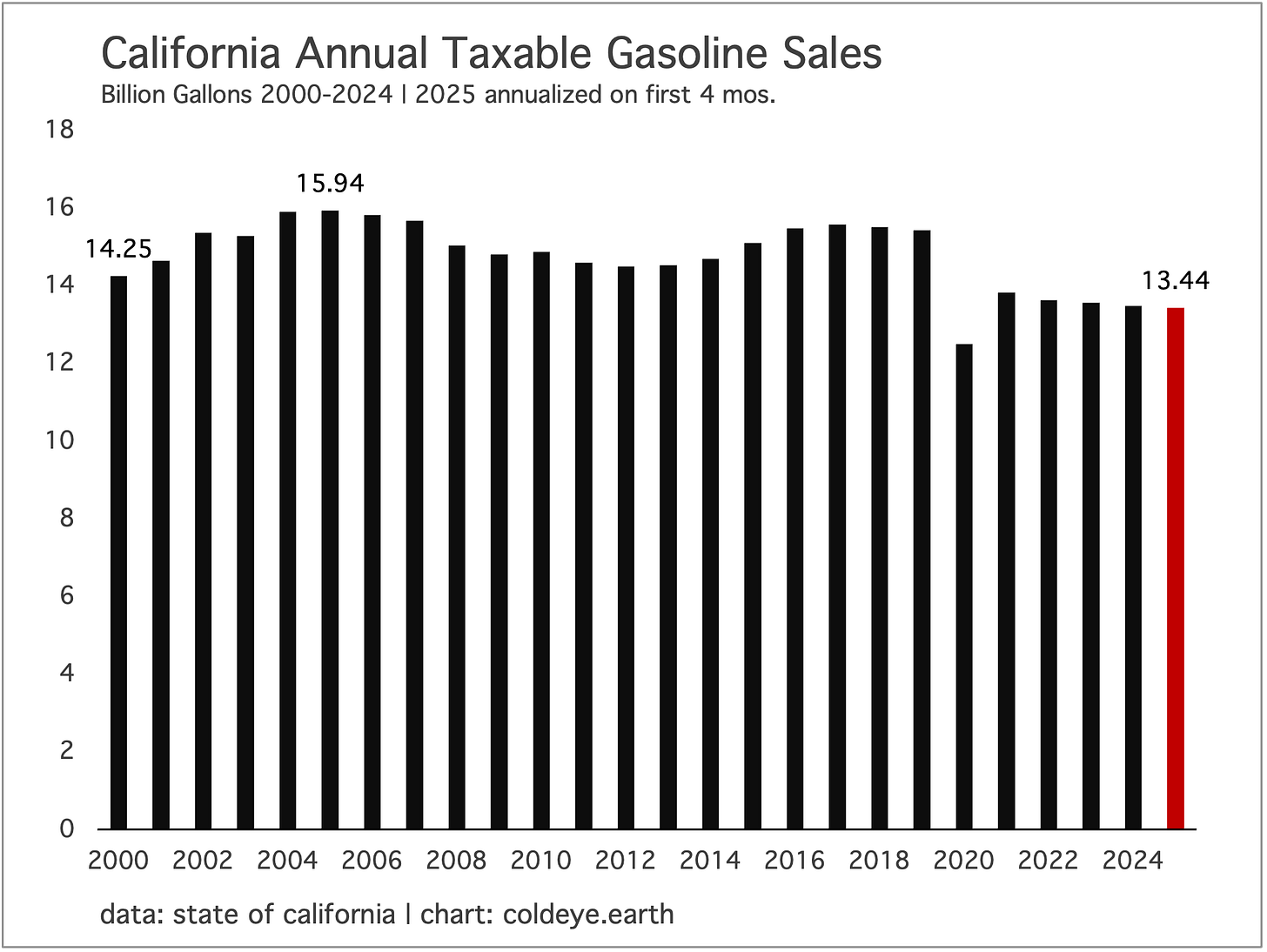 The century-long experience of gasoline consumption in California is potentially a useful model for how, after great effort, we can halt the growth of at least one category of fossil fuels: petroleum in transportation. Higher gasoline taxes, the buildout of public transit, strict fuel efficiency rules, incentives for EV adoption, disincentives for ICE vehicle ownership—these are the tools by which California finally got petrol consumption under control. The prize? Five straight years of gasoline consumption decline, and a peak of consumption that is now 20 years in the rearview mirror.