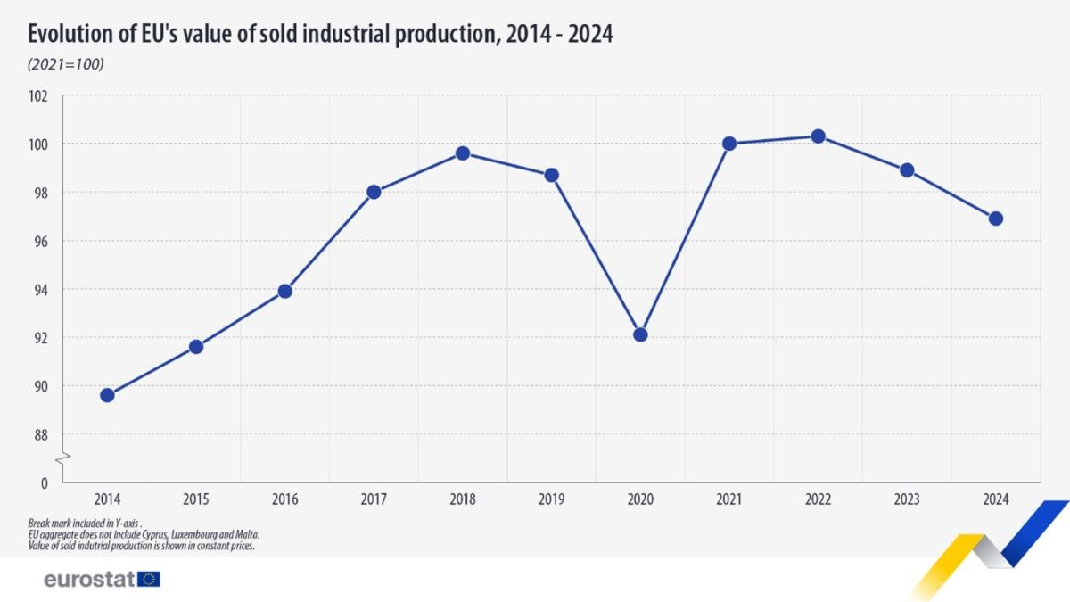 …The EU’s production of manufactured goods decreased by -2.0% in 2024 compared with 2023 and in the previous year, it decreased by -1.4% compared with 2022.
