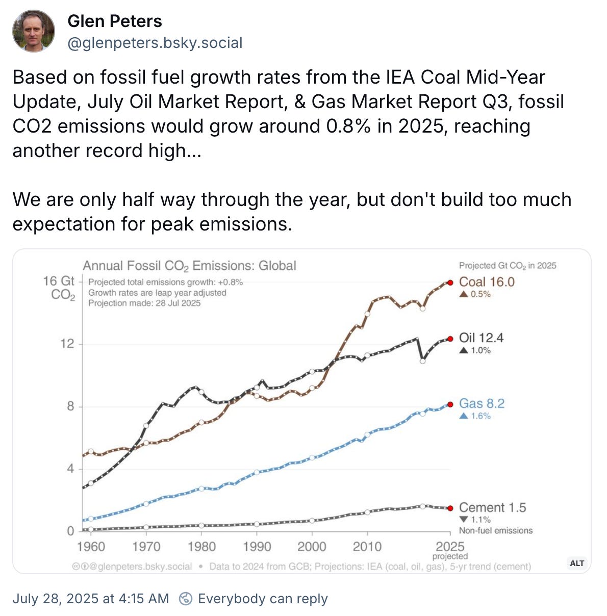 Early indications are that global emissions will grow by about 0.8% this year. The quick assessment comes from Glen Peters at Oslo-based CICERO after his review of mid-year IEA reports on coal, natural gas, and oil. Here is Peters on BlueSky: