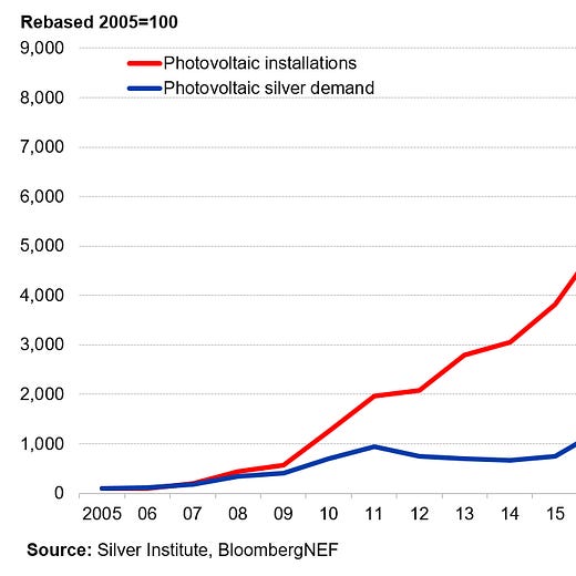 Speaking of theoretical gold, it might be a good time to check in on actual silver and the role it plays in solar manufacturing. As most may know, silver is a component of photovoltaics (PV), and according to the Silver Institute composes about 10% of total global annual demand for silver. But what is the trend? PV output has soared the past decade and that raises familiar concerns about material costs and availability, as intuitions tell observers that demand could lead to shortages. This is an oft-repeated concern across the renewable space, especially for rare earth metals. Well, it turns out, the learning rate (again) has something to say. Unsurprisingly, manufacturing efficiencies over time wring out savings and that invariably means producing either greater volumes with the same quantity of inputs or the same volume with fewer inputs. Something like this is happening with silver demand and PV output, though, we might want to inspect recent trends before we come to any hard conclusions.