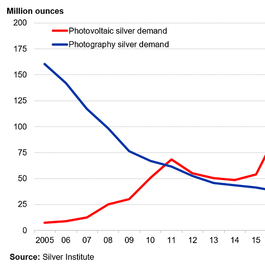 OK, all fine and good. That said, the global silver industry clearly is ever more reliant on PV demand these days, having lost photography as a sustaining demand center during the 20th century. However, it’s also clear the PV industry is driving a meaningful increase in demand for silver, even if softened by the miracle of the learning rate. Indeed, when you inspect the table offered up at the Silver Institute link, the steady call currently, of roughly 100 million ounces a year, does represent a doubling from earlier in the decade.