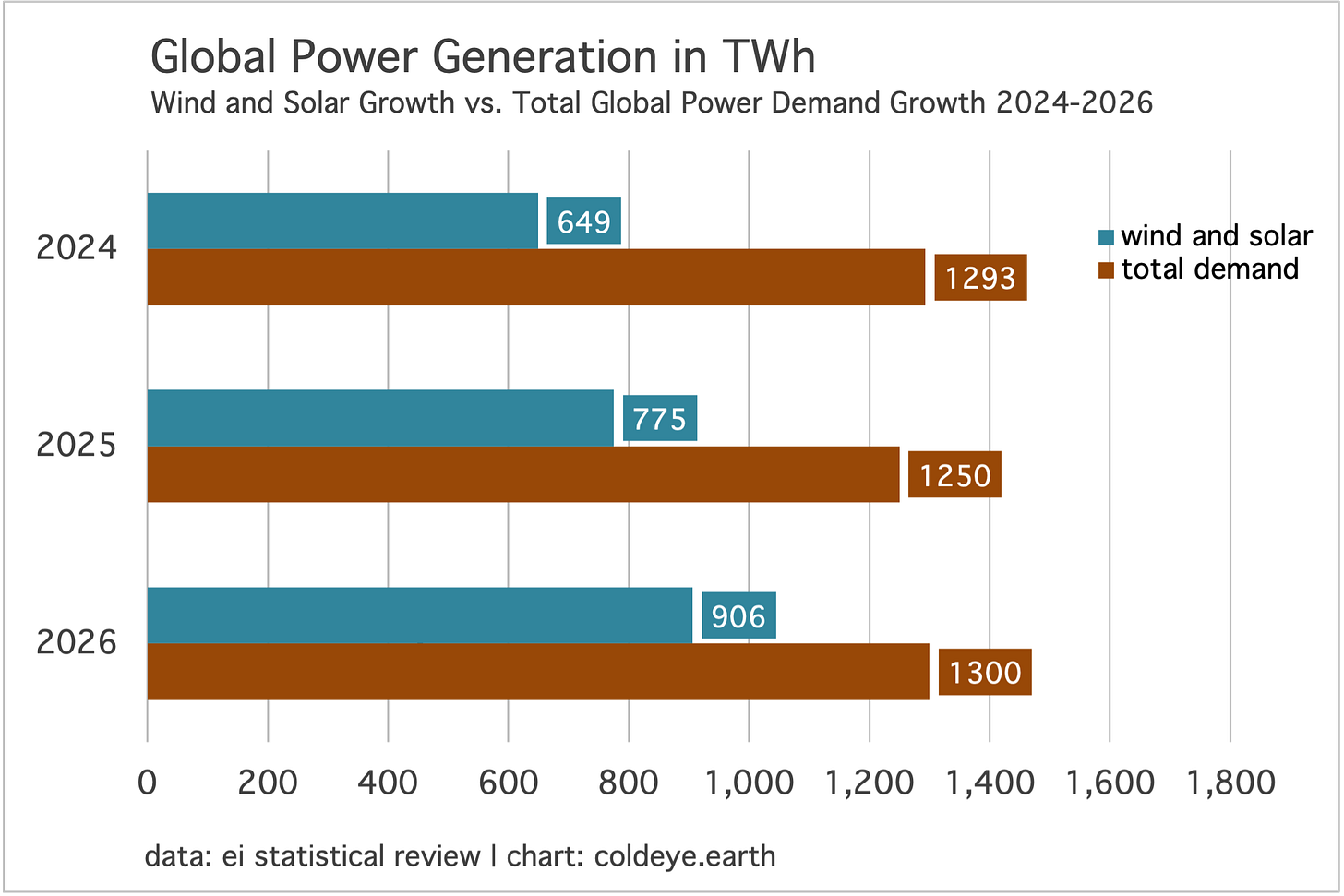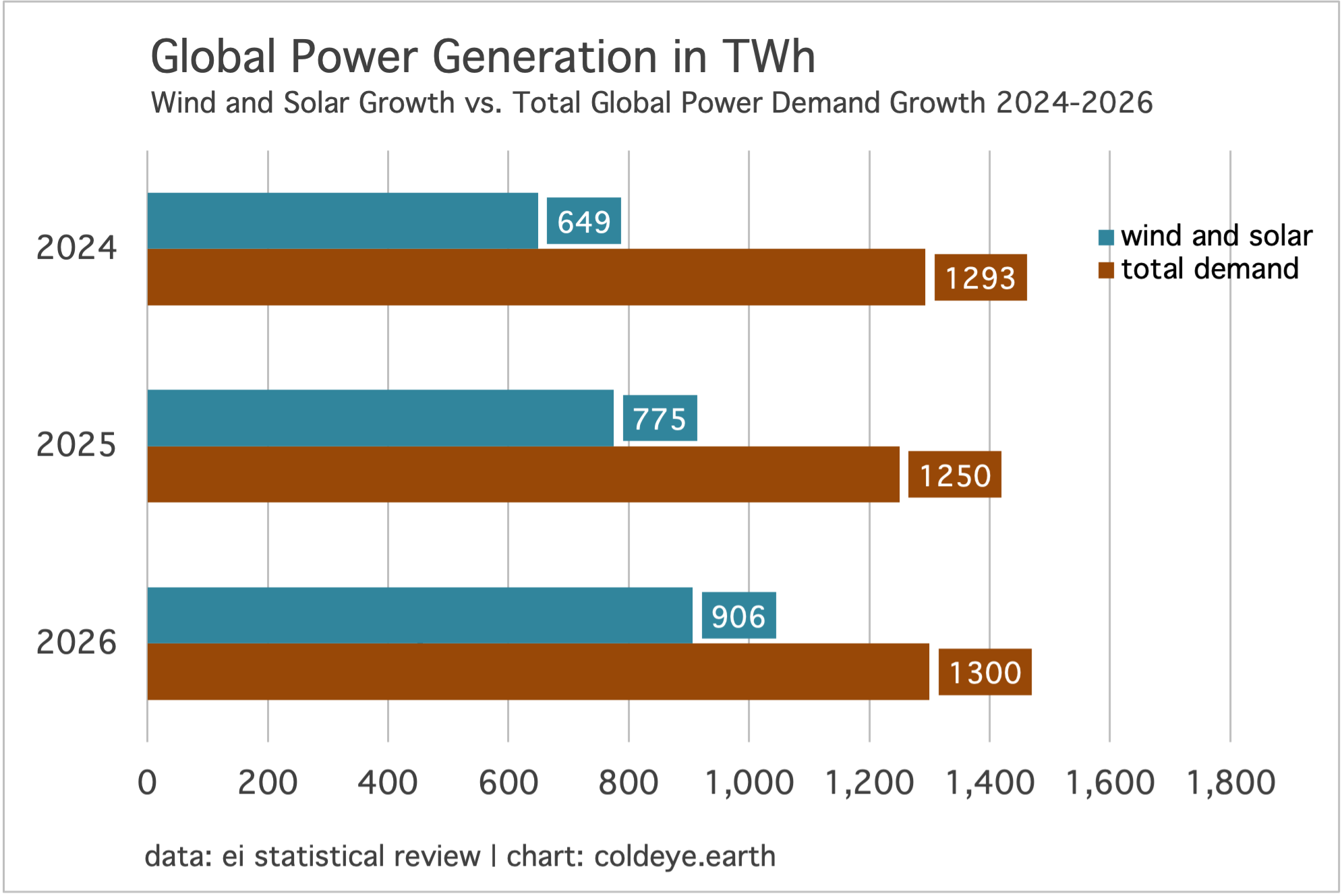 In the current energy transition, the most important metric to follow is how much of yearly global power demand growth can be covered by low-carbon resources. Cold Eye Earth, along with its preceding publications (gregor.us and terrajoule.us), has tracked this metric for over a decade, hoping that this threshold would soon be crossed. But with the exception of a couple of years when total wind and solar grew moderately toward that target, we have continued to wait patiently for a better outcome. (Total global power demand actually fell in the pandemic year, 2020, but the that year remains an unhelpful outlier in all datasets.)