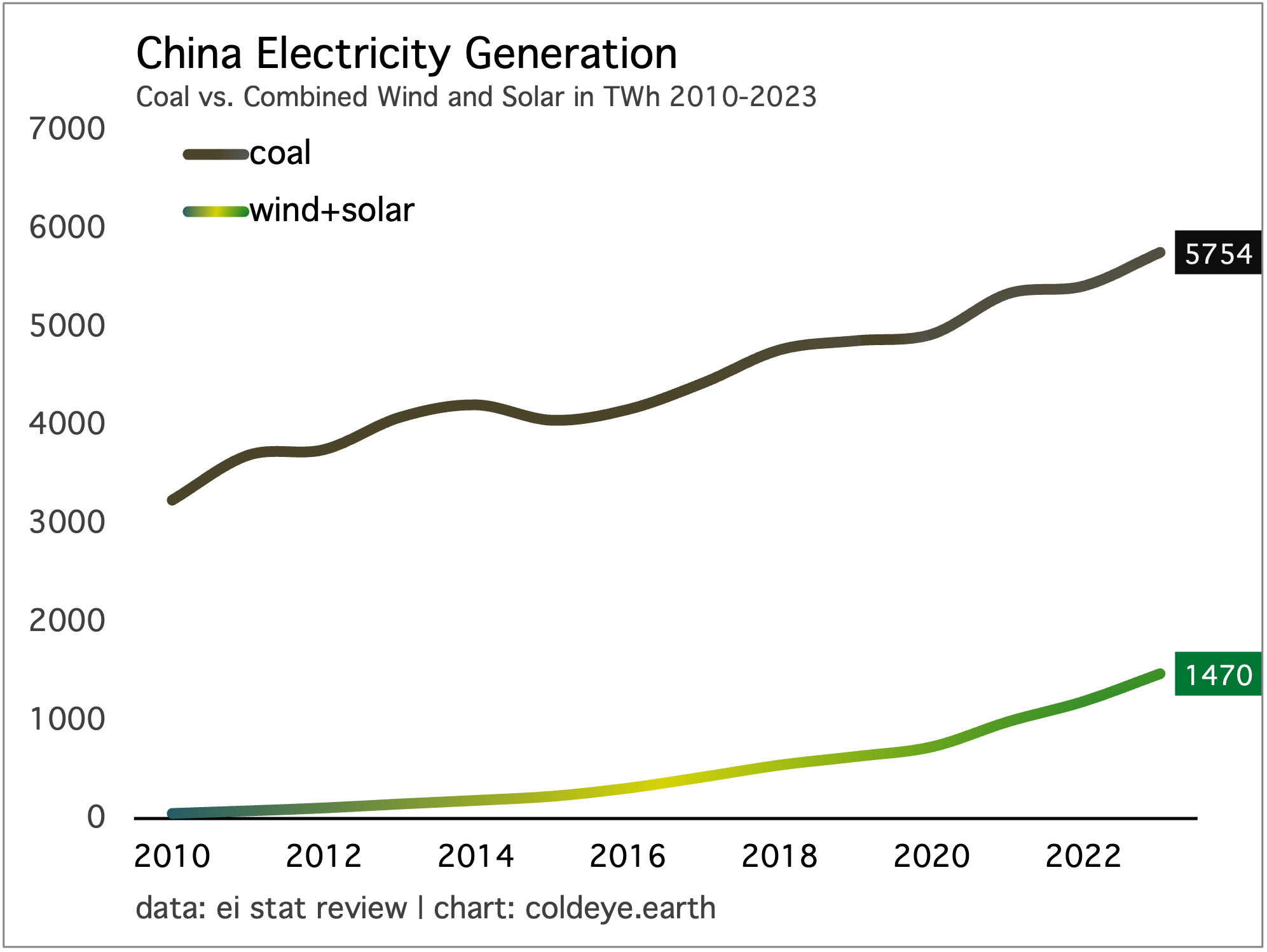 Now let’s check in with two views of wind and solar in China’s power sector. The first chart simply logs the advance of coal vs. combined wind and solar over the past decade. The portrait here is one of more, more, more. Lots more power coming from wind and solar, but lots more power coming from coal too. China remains the world’s top manufacturer. So its powergrid needs lots of new generation. Wind and solar? Great. But still more coal. Not so great Again, coal will eventually be halted, along with natural gas. But we will only know that in hindsight.