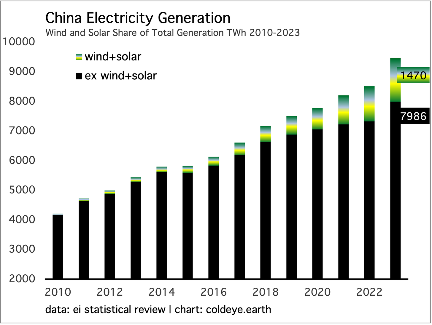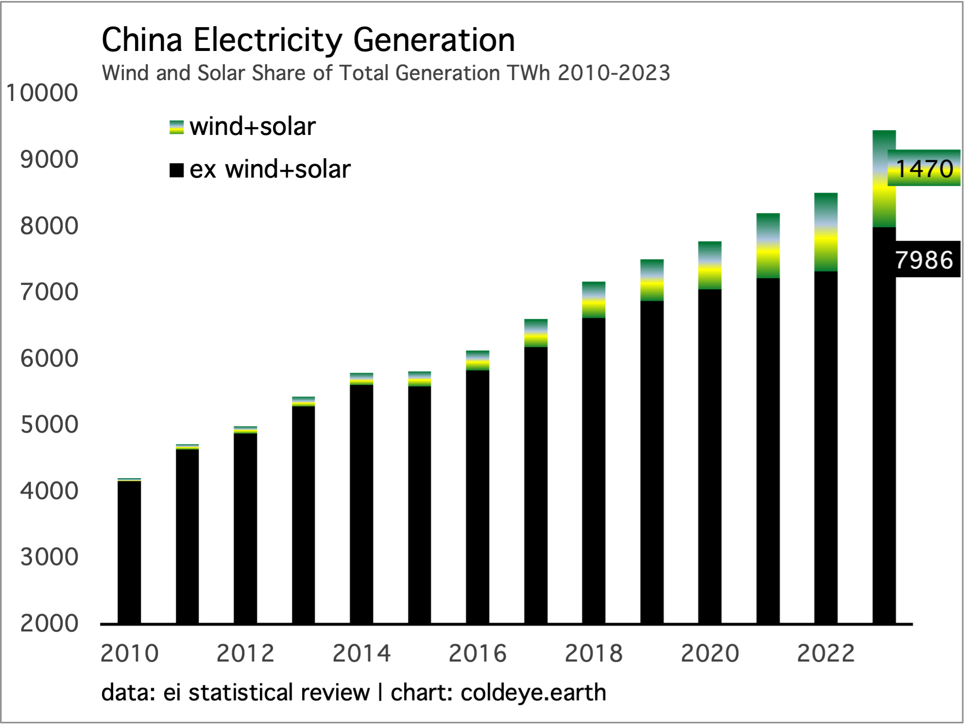 Now let’s move on to the actual wind+solar share of total China power generation. In 2023 (the latest official data) combined wind and solar reached 1470 TWh out of total generation of 9456 TWh. While impressive at a 15.5% share, sources ex-wind+solar (the black bar) continue to grow. That black histogram will eventually flatten out. Indeed, its growth clearly slowed in 2018 - 2022. Yet, in 2023, despite another huge year for wind and solar growth, all other sources bolted higher too.