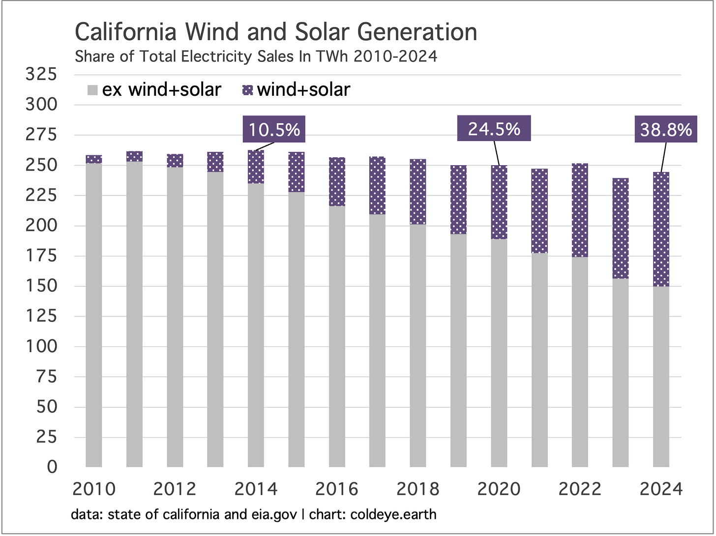 • Combined wind and solar now provide a truly extraordinary 38.8% of electricity sales.