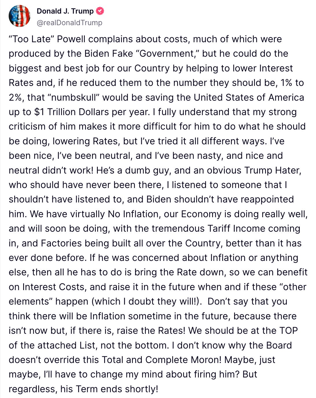 Functionally, Powell’s strong assertions this week that tariffs risk inflationary pressure wound up acting as a kind of test of the administration’s touchy, defensive reactions to any criticism of the policy. Let’s also remember—even if it seems tangential—that when Musk and Trump had a falling-out and Musk accused Trump of being on the Epstein list, one of the bombs he lobbed toward the White House was “Ha ha, and the tariffs are already going to cause a recession in the second half of the year.” So we can conclude that tariff discourse inside the administration has likely not been uniform, and there has no doubt been some consternation about the potential damage the tariffs could wind up doing to the economy.