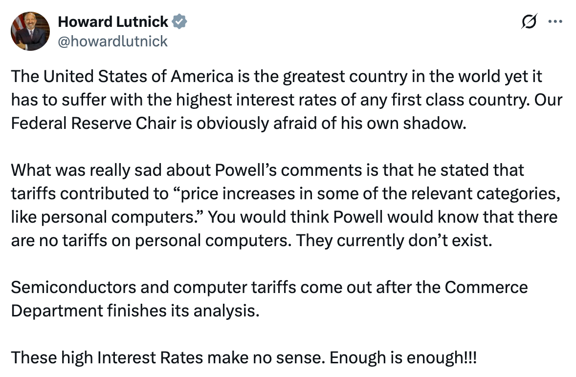 The flogging of tariffs as a complicating factor in setting monetary policy clearly got through not just to the president, but to Howard Lutnick, the hapless and clueless commerce secretary. He too took to social media, to complain bitterly about the tariff accusations. That makes sense, of course. No one has promoted tariffs more vigorously, nor done a worse job of explaining them.