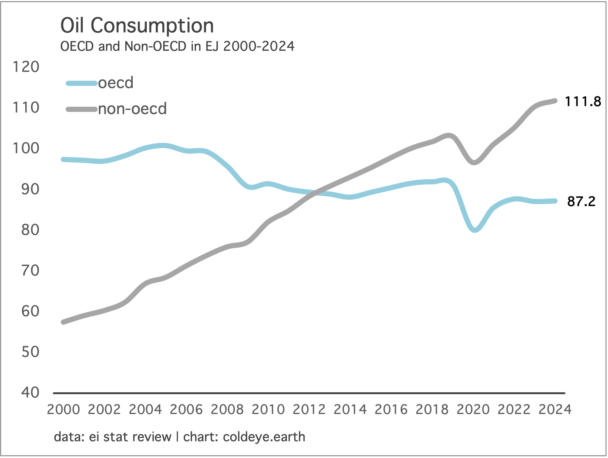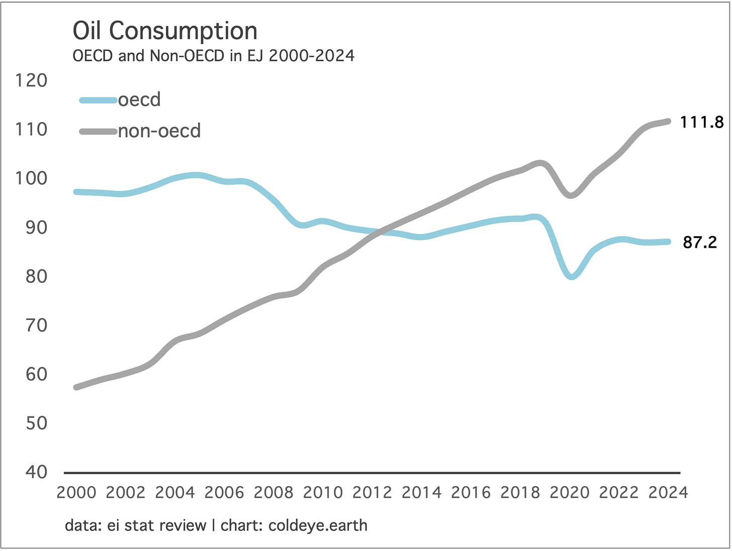 Forever is a long time. And yet the events now set in motion by the U.S. attack on Iran are likely to give way to a new energy security regime of very lengthy duration. While energy history is anchored by the great, singular transitions, it’s also the case that wars, embargoes, and shortages also play a reshaping role, cutting deep grooves in the psyches of nations and kicking off new policy regimes. In the aftermath of Russia’s attack on Ukraine, for example, the EU’s natural gas consumption stepped down about 20% from its 2021 highs; and that demand destruction has roughly been maintained as the EU has raced forward to adopt heat pumps and other gas-saving measures. Going back a bit further, the 2004—2008 global bull market in oil, which resolved into a fearsome spike, put a halt to decades-long OECD demand growth. And that growth never recovered (see chart below). Going even further back, oil enjoyed a dominant 50% share of all energy consumed in the world coming into the oil crises of the 1970s. Today? Oil has fallen to just a 33% share of total world energy consumption. Pain, as always, is a stern teacher.