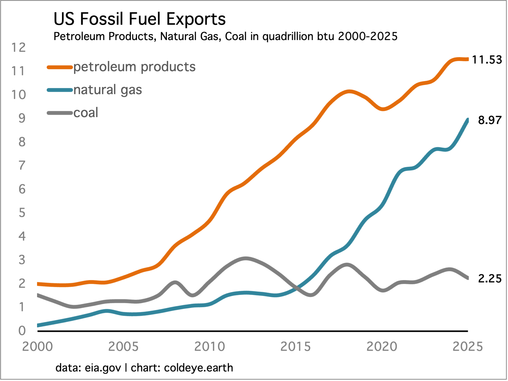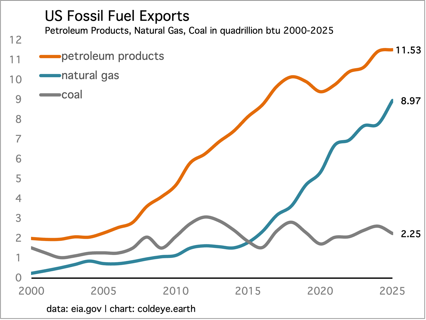 • U.S. exports of both coal and natural gas in the form of LNG will quickly rise to meet current export capacity; and if demand for those two fuels doesn’t let up, the U.S. energy economy will start exploring ways to expand that capacity. We must also remember that the U.S. has been expanding exports of both these fuels steadily over the past decade. U.S. coal exports have risen over this time partly due to the reduction in domestic demand. LNG capacity has risen in part because North America has economically recoverable natural gas reserves that are nothing less than gargantuan. So export momentum is already in the mix. Finally, U.S. petroleum product exports (not crude oil) may be constrained from increasing much as the combination of lower lower global supply but also lower global demand makes may offset each other. However, there’s no question that prices for those products will rise.