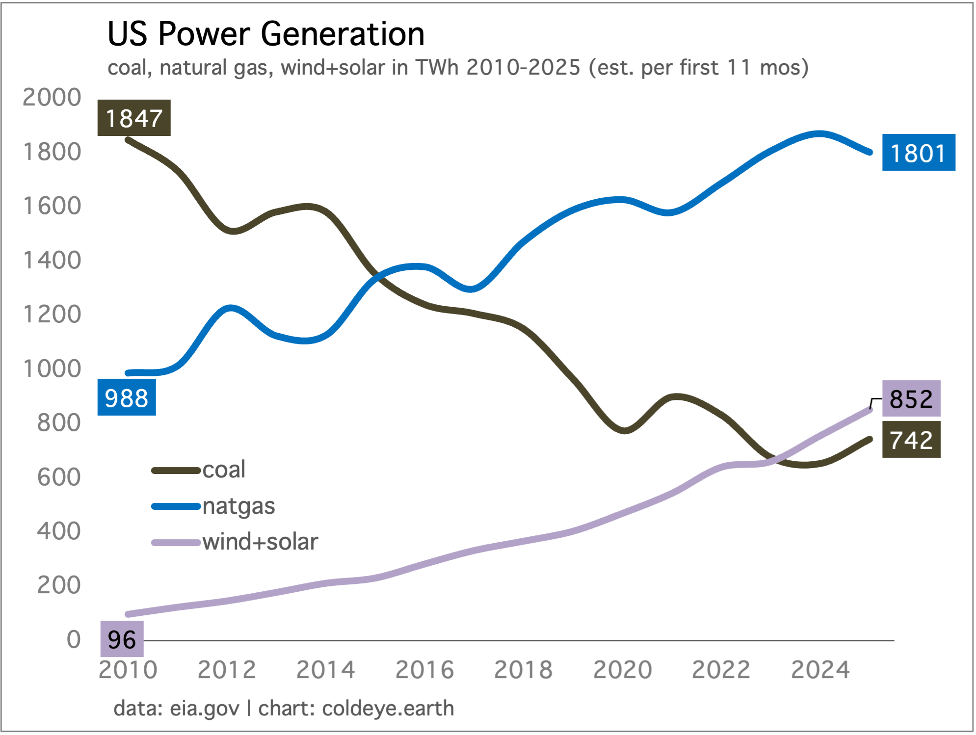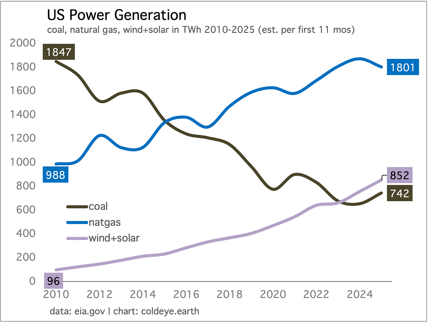 Meanwhile, natural gas and combined wind and solar have each advanced by about 800 TWh since 2010, not only covering coal’s losses but advancing further to cover total demand, which finally budged from that 4,000 TWh level and has now grown to 4,500 TWh per year.